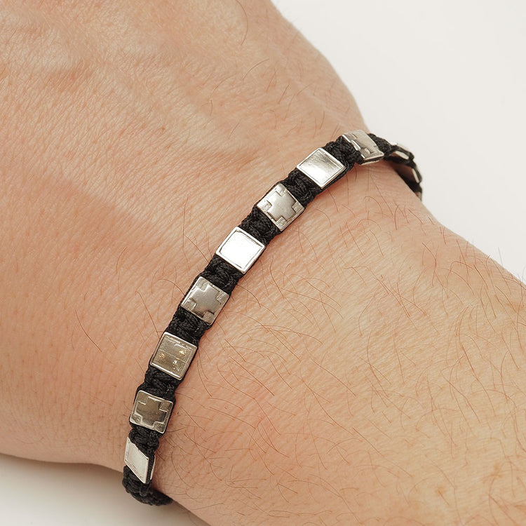 Elevate his style with The Guardian Cord Bracelet, a handcrafted piece that embodies strength and sophistication. Made from black cord intricately knitted in a hand-knit style, this bracelet features sterling silver flat square beads woven throughout. Each alternate bead is adorned with a cross symbol, adding a touch of timeless elegance and a sense of protection. Perfect for the modern man who values both style and meaning, The Guardian Cord Bracelet is a standout accessory for any occasion.
